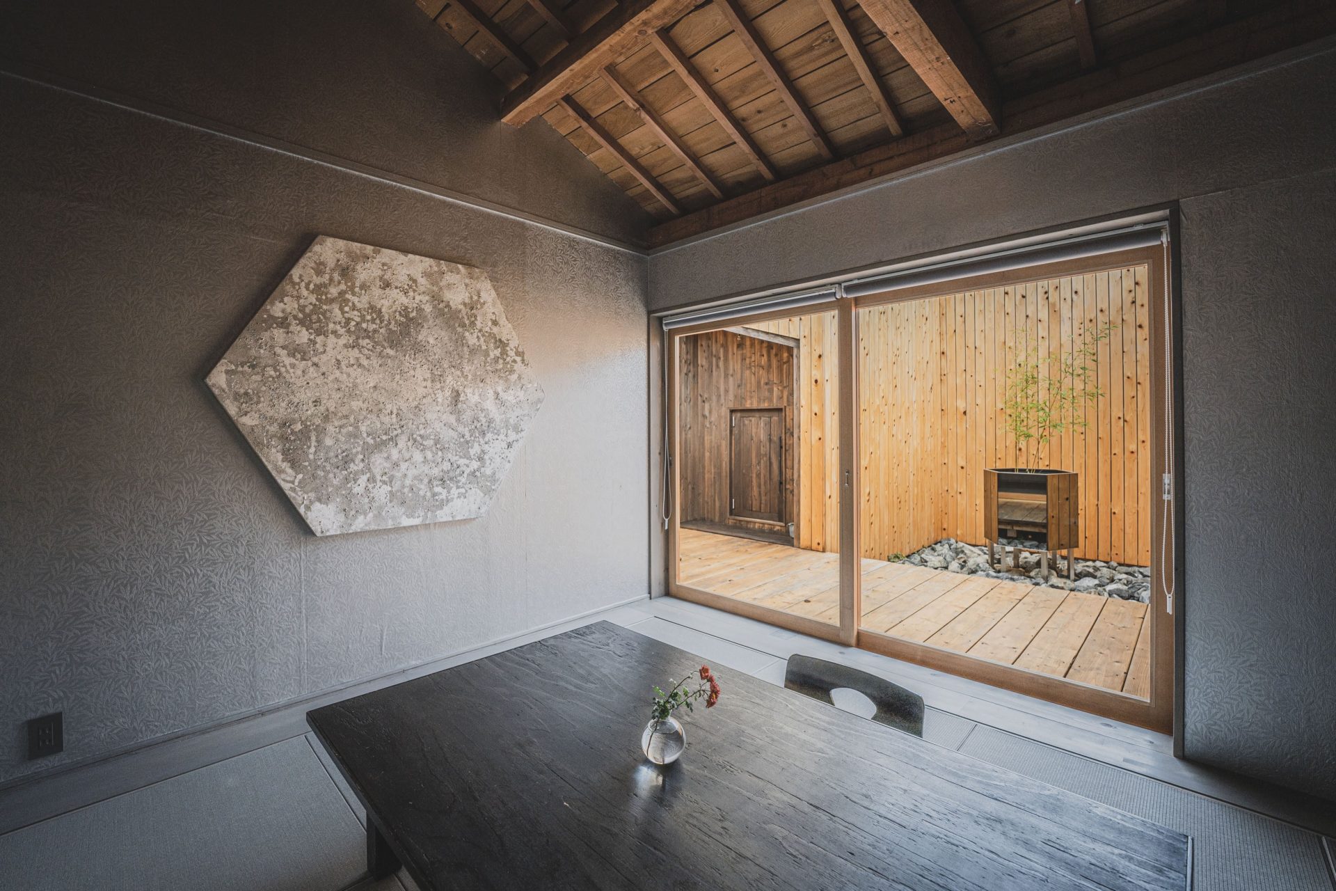 築100年の歴史のある古民家をフルリノベし自然素材を基調とした、シックな空間が特徴です。 また、各部屋にはオーナーであるアーティスト・田中英行の作品が展示されています。